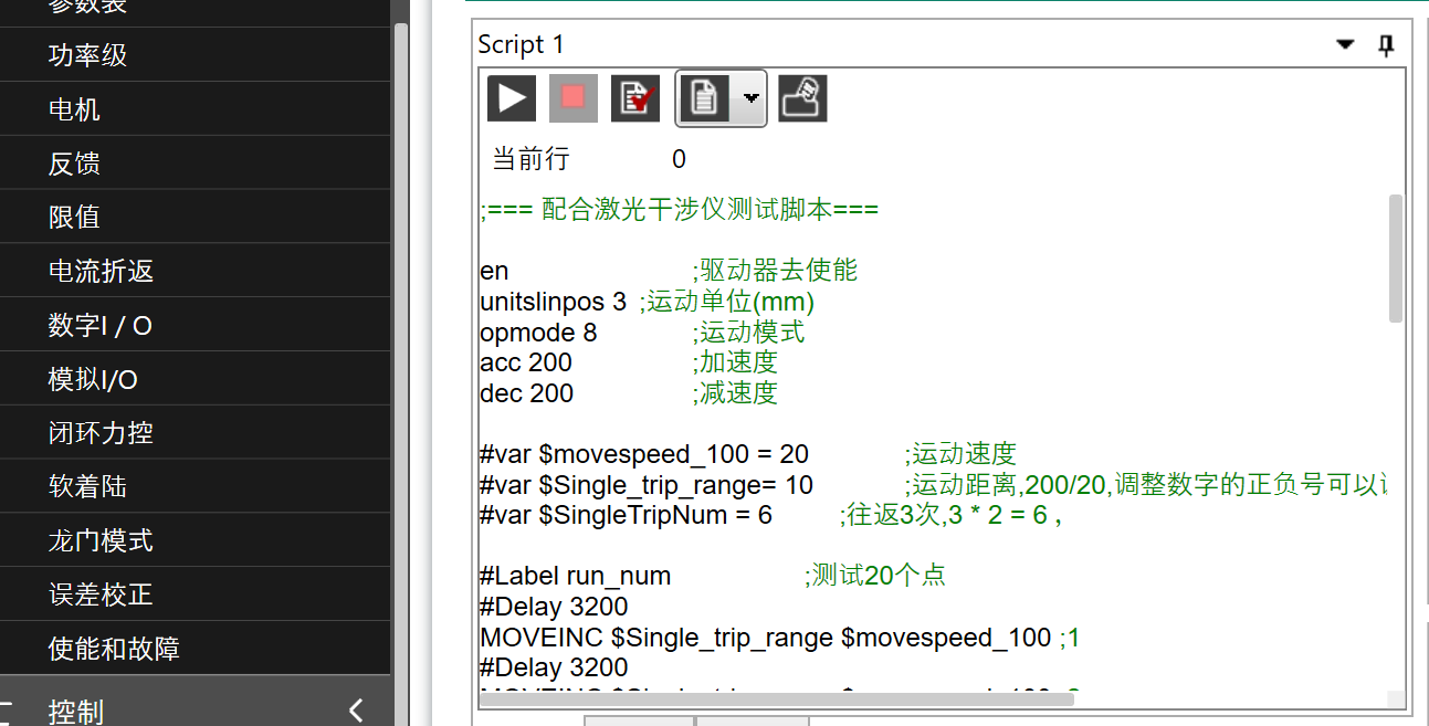 ;=== 配合激光干涉仪测试脚本 (注:此代码未上驱动器验证,仅供参考,注意stop)===