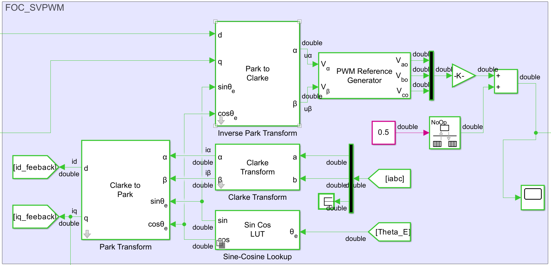 SVPWM模块,点击模块选择SVM,此模块的输出需要归一化,在后面添加一个 Gain 模块, 增益设置为 1/(2*pmsm.DC/sqrt(3)) ,再+0.5,将信号移到 [0,1] 范围。因为查看此模块封装内部可发现,在输出最终结果前 Gain 了个 2/sqrt(3) ,所以后面归一化把此参数补回去。