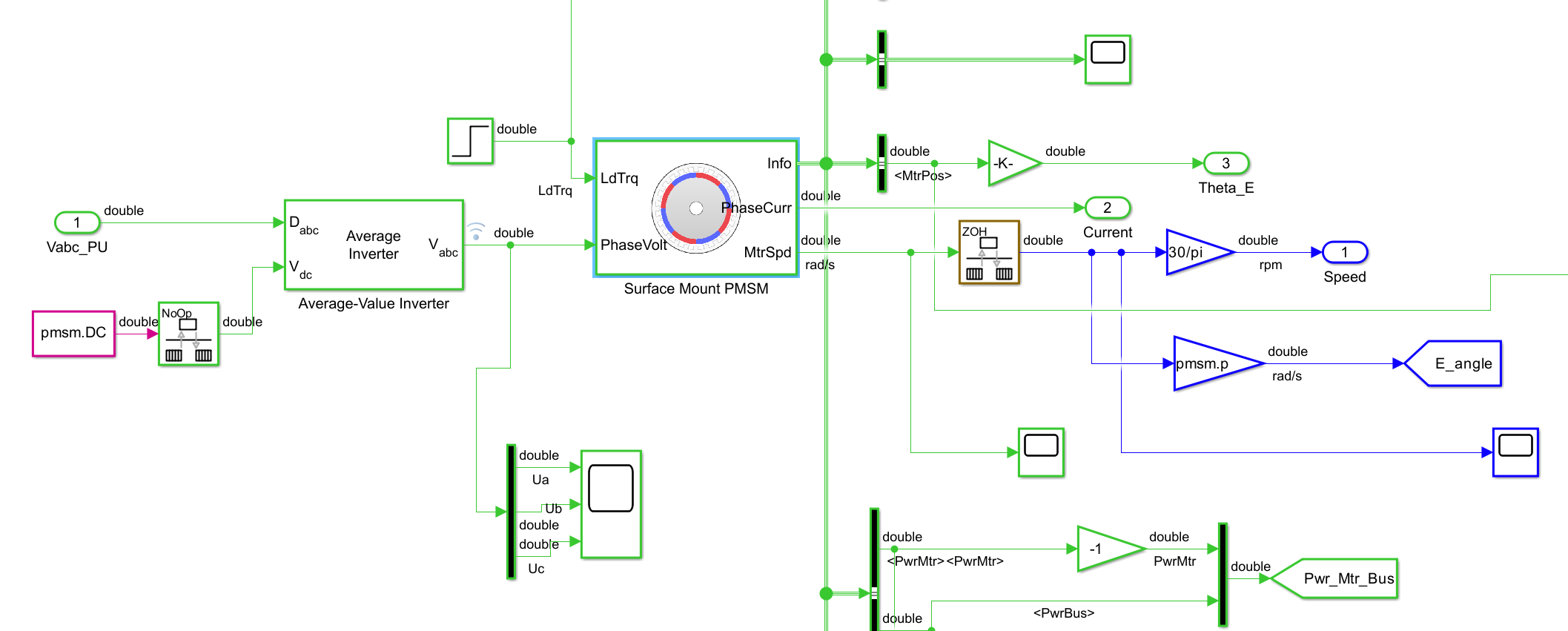 为了较快的搭建验证模型,直接选择 Motor Control Blockset 中的模块。 如果自己想搞清楚每个模块是怎么计算的,可以使用基础模块搭建,就比较考验耐心。